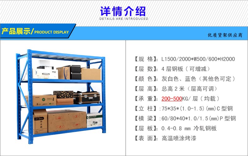 5、常用规格:L2000*D600*H2000mm,4层,每层铺钢层板或木层板。